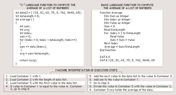 Programming languages allow people to communicate with computers. Once a job has been identified, the programmer must translate, or code, it into a list of instructions that the computer will understand. A computer program for a given task may be written in several different languages. Depending on the task, a programmer will generally pick the language that will involve the least complicated program. It may also be important to the programmer to pick a language that is flexible and widely compatible if the program will have a range of applications. The examples shown here are programs written to average a list of numbers. Both C and BASIC are commonly used programming languages. The machine interpretation shows how a computer would process and execute the commands from the programs.