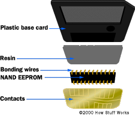 As shown below, SmartMedia cards are elegant in their simplicity. A plane electrode is connected to the Flash-memory chip by bonding wires. The Flash-memory chip, plane electrode and bonding wires are embedded in a resin using a technique called over-molded thin package (OMTP). This allows everything to be integrated into a single package without the need for soldering.