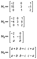 In the above matrices, a, b, and c are arbitrary numbers. In place of brackets, parentheses or double vertical lines may be used to enclose the arrays. The horizontal lines, called rows, are numbered from the top down; the vertical lines, or columns, are numbered from left to right; thus, -1 is the element in the second row, third column of M1. A row or column is called a line.