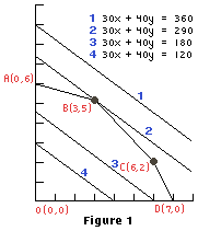 The equation 30x + 40y = p, indicating the profit, also represents a straight line; the equation 30x + 40y = p’ represents a parallel line that is above, coincides with, or is below the first line, as p’ is greater than, equal to, or less than p. The profit will be maximized by choosing the line, of the family of parallel lines, that just touches the region OABCD above, namely, the line through the vertex B(3,5). The manufacturer will earn a maximum profit (of $290) if 3 articles of variety V1 and 5 of variety V2 are made per day. Any other quantities of the two varieties, within the constraints of the time limitations, will yield a smaller profit.