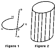 More generally, a cylinder need not have circular bases, nor must a cylinder form a closed surface. If MNPQ is a curve in a plane (Fig. 1), and APB is a line that is not in the plane and that intersects the curve at a point P, then all lines parallel to AB and intersecting MNQ when taken together form a cylindrical surface. If the curve MNPQ is closed, the volume enclosed is a cylindrical solid. The term cylinder may refer to either the solid or the surface. The line APB, or any other line of the surface that is parallel to APB, is called a generatrix or element of the cylinder, and the curve MNPQ is called a directrix or base. In a closed cylinder, all the elements taken together form the lateral surface. A closed cylinder is circular, elliptical, triangular, and so on, according to whether its directrix is a circle, ellipse, or triangle. In a right cylinder, all elements are perpendicular to the directrix; in an oblique cylinder, the elements are not perpendicular to the directrix. In general, the volume of a closed cylinder between the base and a plane parallel to it is given by Bh, in which B is the area of the base and h is the perpendicular distance between the two parallel planes; see Fig. 2. See Solid Geometry.