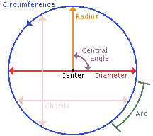 Any line segment that passes through the center and is terminated by the circle is called a diameter of the circle. A radius is a line segment from the center of the circle to the perimeter of the circle. A chord is any straight-line segment that is intercepted by the circle. An arc of a circle is a portion lying between two points on the circle. A central angle is an angle with the vertex at the center of the circle and with sides forming radii of the circle. A central angle is subtended by the arc that lies between the points at which the central angle's sides intersect the circle.