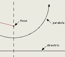 A parabola is a curve that describes all of the points equidistant from a line, the directrix, and a fixed point, the focus. As illustrated, the distance between the focus and a point on the curve (d1) always equals the distance between the directrix and the same point on the curve (d2).