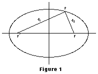 An ellipse may be defined as the locus of all points, P, the sum of whose distances, d1 and d2, from two fixed points is a constant (see Fig. 1). The two fixed points that define an ellipse are known as its foci and are labeled F and F’ in Fig. 1. This property of an ellipse is often used for drawing the figure. If pins are placed in the drawing surface at the two foci and a length of string is tied loosely between them, a point holding the string taut will trace an ellipse as it moves.