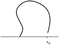 Fig. 6. The trace is about to hit the axis at x0 and enclose a region. At the time this happens, the whole region including the point x0 is mapped by gt to the same point at.