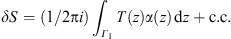 The conclusion of all this is that the effect of an infinitesimal conformal transformation on any correlator of observables inside Γ1 is the same as inserting a contour integral ∫ T (z)α (z) dz/2πi into the correlator.
