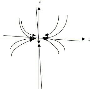 On the other hand, the fixed points of the form ((2l + 1)π/β, 0) are all sinks with local phase plane behavior shown below in Fig. 4. Fig. 5 shows the entire phase plane of Eq. (11) obtained by collecting the above results.