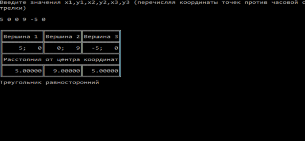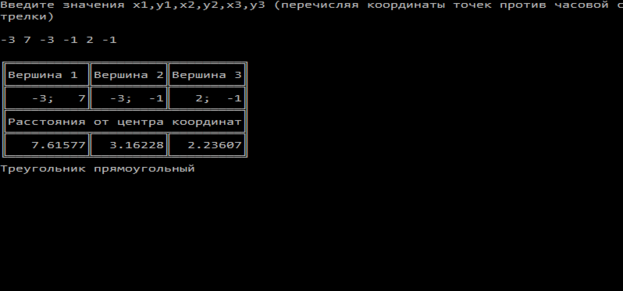Вывести таблицу с заголовками, которую создать с помощью символов псевдографики, заданные координаты и расстояния от начала координат до вершин в порядке обхода против часовой стрелки, ведя отсчет от оси ординат.