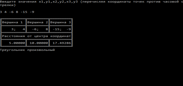 С клавиатуры последовательно вводятся координаты вершин треугольника, ведя перечисление против часовой стрелки от оси ординат. Ввод осуществляется в виде: x1 y1 x2 y2 x3 y3 через пробел. Сначала вводится абсцисса, затем ордината вершины.
