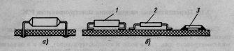 а — по традиционной технологии; б — по технологии поверхностного монтажа;