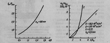 Толщина пластины h пересчитывается в частоту свободных колебаний через нормированную относительно площади массу т0 и цилиндрическую жесткость D. При увеличении толщины пластины масса т0 возрастает линейно, а цилиндрическая жесткость — пропорционально h3 . Зависимости m0/m0н (прямая 1) иD/DH (кривая 2) от относительного изменения толщины пластины (hн=0,5 мм ) из фольгированного стеклотекстолита (E = 30,2·109 Па, ρ=1,85·103 кг/м3, ε=0,22)