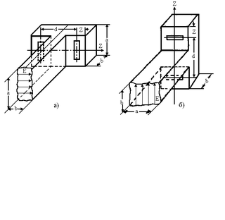 Конструкция двухщелевого облучателя может быть осуществлена в виде закрытого на концах Т-образного прямоугольного волновода (рис.11). Щели в этом волноводе прорезаются симметрично относительно питающего волновода. В зависимости от заданной поляризации поля излучения облучатель располагается либо как оказано на рис.11а (для горизонтальной поляризации электри-ческого поля) либо как показано на рис. 11б (для вертикальной поляризации электрического поля).