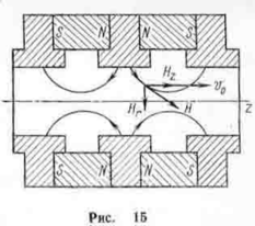 Существенный недостаток первых типов ЛБВ – это наличие соленоидов для фокусировки электронного потока, потребляющих большую мощность и имеющих значительную массу. Наибольшее уменьшение массы фокусирующих систем и всей ЛБВ обеспечивает периодическая магнитная фокусировка кольцевыми магнитами, разделенными ферромагнитными прокладками (рисунок 13). На электроны, летящие вдоль оси со скоростью