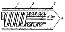 в которой используется ЗС, похожая на двухзаходную спираль. Ее иногда называют «винт со спиралью», так как' спираль 1 расположена в винтовой канавке, прорезанной на поверхности цилиндрического стержня 2. Полый стержень выполняет роль внешнего проводника коаксиальной линии, используемой для вывода энергии ЛОВ. Внутренний проводник 3 коаксиального вывода непосредственно переходит в спираль. Противоположно направленные токи в проводниках коаксиальной линии обеспечивают противофазное возбуждение винта и спирали, при котором данная система становится обратно-волновой. В лампе Салливена использован трубчатый электронный поток 4, окружающий ЗС.