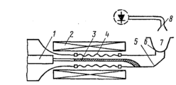 распространяющейся по прямоугольному волноводу с гофрированными широкими стенками 4. Поперечное сечение пролетного канала имело размеры 4х4 мм; ток электронного пучка диаметром 2,6 мм составлял (300—500) А в импульсе длительностью (15—20) нс. Для фокусировки пучка использовался импульсный соленоид, обеспечивающий магнитную индукцию 1 Тл. Вывод энергии ЛОВ представлял 90-градусный волноводный излом 5 со слюдяным вакуумным уплотнением 6 и выходным рупором 7. Излом был необходим для того, чтобы электронный поток не разрушал слюдяное окно. Выходная мощность измерялась с помощью приемного рупора 8 с полупроводниковым детектором. Она достигала 10 МВт в импульсе при к. п. д. -3%.