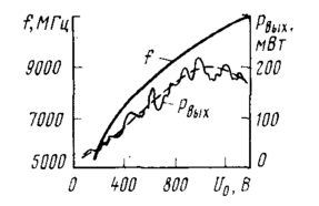 Важной характеристикой ЛОВ является зависимость выходной мощности и частоты генерируемых колебаний от ускоряющего напряжения (рисунок 9). С увеличением ускоряющего напряжения частота генерируемых колебаний увеличивается, т. е. имеет место электронная перестройка частоты генерируемых колебаний. Частотная характеристика ЛОВ является нелинейной. Закон изменения частоты обусловлен дисперсией замедляющей системы.
