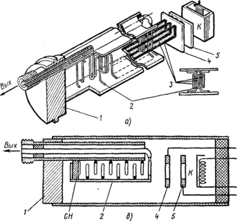 На рисунке 11 показана одна из типовых конструкций ЛОВ. Вместо встречных штырей в ЗС такой ЛОВ используют встречные шпильки 2. Это позволяет пропустить вдоль ЗС три ленточных электронных потока 3, формируемых электронной пушкой, на аноде 5 и диафрагме 4 которой имеются по три прямоугольные щели. На внешнюю часть коллектора 1 надевается радиатор воздушного охлаждения (на рисунке не показан). Лампа имеет, как правило, пакетированную конструкцию.