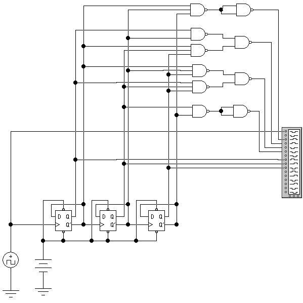 Построим схему распределителя на основе суммирующего счетчика, построенного на D-триггерах.