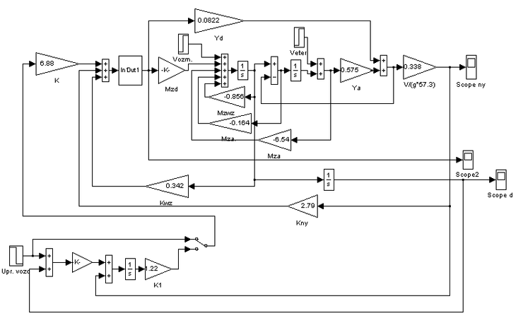 Варьирую коэффициенты обратных связей Kny и Kwz можно добиться получения наиболее быстрого процесса по перегрузке, который наиболее желателен. Однако следует помнить, что при этом значение перерегулирования не должно выходить за пределы 5% трубки