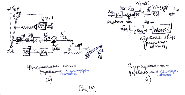 Работа демпфера тангажа с электродистанционным управлением (ЭДУ) может быть представлена схемой (см.рис.44). Здесь обозначены: МТЭ – механизм триммерного эффекта; ДП – датчик перемещений штурвала;