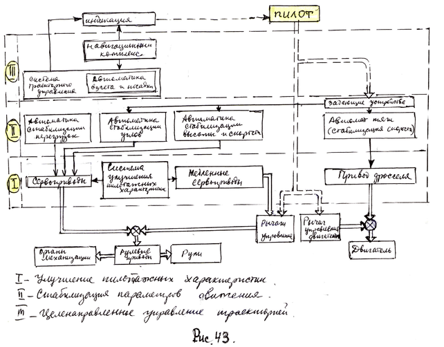 При этом способе пилотирования стратегия управления траекторией центра масс (ЦМ) ВС вырабатывается пилотом. Ориентируясь по пилотажно-навигационным (не командным) приборам систем индикации, пилот сообразно обстановке и этапу полета вызывает тот или иной из режимов стабилизации, выполняемых системами уровня II и автоматом тяги. Управление ВС по намеченной пилотом логике производится посредством его манипуляций с задающими устройствами (рукояткой, задатчиком автомата тяги, кнопкой вызова режимов и т.д.). Автоматика функционирует в составе систем уровней I и II.