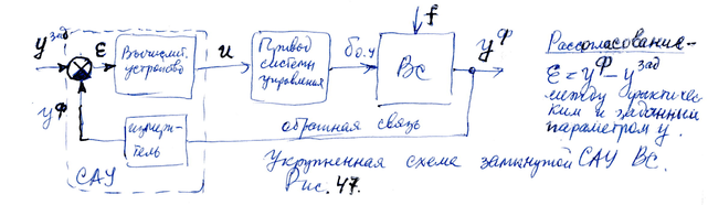В режиме автоматического управления управляющей системой является автоматика уровней II или III (см. рис.43). Процесс управления осуществляется по замкнутому контуру, в котором ВС можно рассматривать как звено системы управления. Укрупнено САУ можно представить в виде схемы (рис.47).