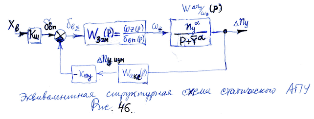 Исследование структурной схемы (рис.45 б) производится последовательно. Сначала анализируется внутренний контур (демпфер тангажа). Для него выведена формула (8.2) для передаточной функции замкнутой системы, которую можно получить после подстановки всех входящих в нее составляющих. В результате свертки внутреннего контура можно рассмотреть следующую эквивалентную структурную схему