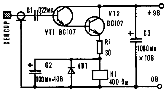 Диод VD1 защищает транзистор от выбросов напряжения при размыкании, а конденсатор С2 сглаживает возникающие пульсации. Транзисторы - маломощные кремниевые, например КТ315 с любым буквенным индексом. Диод - кремниевый, например, Д226, Реле - маломощное, на рабочее напряжение 9В.