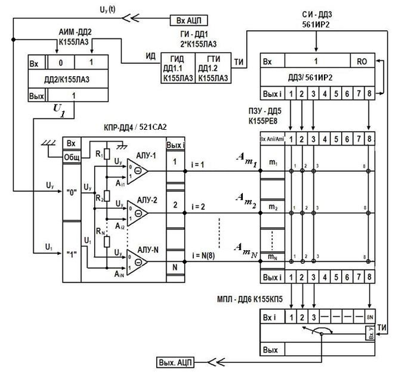 АИ модулятор формирует на выходе АИМ сигнал с непрерывной огибающей Ak(t). Устройство квантования осуществляет замену значений непрерывной огибающей Ak(t) дискретными значениями разрешенных уровней Aik(t). Кодер осуществляет замену каждого k-ого уровня квантования Aik(t) кодовой последовательностью импульсов соответствующего кода. Таким образом, в каждом периоде дискретизации ТД на выходе кодера формируется кодовая группа импульсов, длительностью τД, кодирующая уровень сигнала в данный момент времени. См. рис 39. Генератор импульсов (ГИ ДД1), собранный на двух ИМС (2xК155ЛА3), вырабатывает две последовательности импульсов – дискретизирующих (ИД) с периодом повторения ТД и тактовых (ТИ) с периодом ТТ, синхронизированных таким образом, что ТД = (N+1) ТТ, где N= ТД / ТТ - число уровней квантования, как показано на рис. 38, где N=8. Дискретизация аналогового сигнала команды Uy(t) осуществляется при помощи АИМ – модулятора, выполненного на ИМС ДД2, представляющей собой логический элемент (ЛЭ) “И”, на один из входов один из входов которого “0” (“низкого уровня”) подается сигнал Uy(t), на другой вход – “1” (“высокого уровня”) – импульсы дискретизации от генератора импульсов. Сигнал на выходе модулятора, соответствующий, уровню логической “1” ИМС, появляется при одновременном присутствии сигналов на обоих его входах [ДД2], как показано на рис.39.