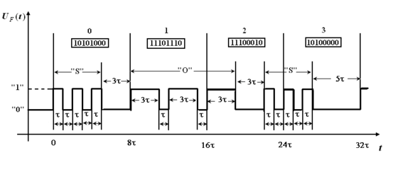 Кодирование заключается в том, что вся последовательность видеоимпульсов, образующая ТЛГ сигнал, разделяется на равные интервалы длительностью 8τ, как показано на рис. 41 для сигнала “SOS”, где τ соответствует длительности наиболее короткого видеоимпульса ТЛГ – сигнала – длительности точки. При этом каждый такой интервал 0, 1, 2, 3 представляет собой 8 – битное информационное слово двоичной алгоритмической азбуки или 8–ми разрядный цифровой код ЦИС с длительностью символьного импульса, равной τ.