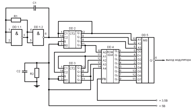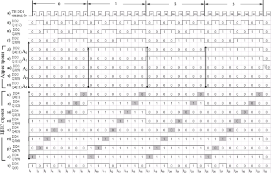Тактовые импульсы (ТИ) с выхода ГТИ (ДД1) поступают на вход восьмиразрядного счетчика импульсов на двух ИМС (ДД2, ДД3), соединенных последовательно. Выходы счетчика Q1,Q2,Q3 ДД2 соединены с адресными входами МПЛ ДД5 “М5”(А1, А2, А3), а выходы ДД2: Q -4 и ДД3 Q1,Q2,Q3,Q4 – с адресными входами ПЗУ (ДД4) “ROM” – А0, А1, А2, А3, А4.