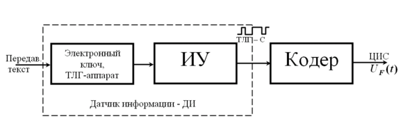 Обобщенная функциональная схема формирователя показана на рис 40. Передаваемое письменное сообщение – текст преобразуется в ТЛГ-сигнал датчиком информации (ДИ), который представляет собой механический или электронный ключ, управляемый оператором, или телеграфный аппарат. ТЛГ-сигнал, сформированный на выходе ДИ в виде последовательности видеоимпульсов различной длительности, после усиления в импульсном усилителе (ИУ) подается на выход кодера.