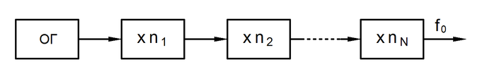 , схема синтезатора частот ПКС реализуется в виде цепочки каскадов умножителей частоты, как показано на рис. 57.