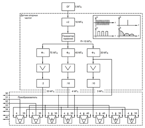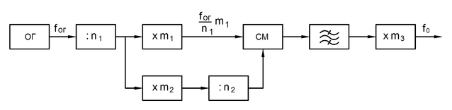 Синтезатор частот прямого когерентного синтеза осуществляет формирование колебаний путем серии линейных преобразований когерентных гармонических колебаний с частотой, кратной частоте высокостабильного опорного генератора fОГ. Сущность линейных преобразований сводится к выполнению алгебраических операций умножения, деления, сложения и вычитания, таким образом, что частота выходного сигнала f0 связана с частотой опорного генератора (ОГ) дробно-рациональным соотношением: