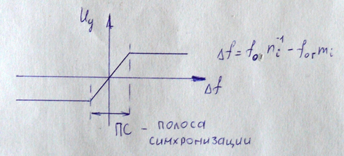 Основным элементом схемы является фазовый детектор, характеристика которого представлена на рисунке 60. Перестраиваемый генератор представляет собой генератор управляемый напряжением, или ПГ-ГУН, в колебательный контур который включен варикап, обеспечивающий перестройку частоты при изменении действия на него постоянного управления напряжения UУ. Колебания с выхода перестраиваемого генератора, после деления их частоты в ni раз, в делителе ДПКД , подающий на вход ФД, а на другой его вход подаются колебания ОГ, частота которых умножена в mi раз с выхода ГГ – умножителя частоты. Выходное напряжение ФД UУ – пропорционально разности частот на его выходах, которые определятся соотношением: