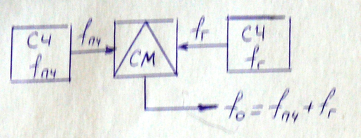 . Источником сигнала гетеродина – является ГУН на транзисторе VT-1, синхронизируемый по частоте, колебаниями высоко стабилизационного ОГ, с частотой 10МГц. При помощи петли ФАПЧ, образуется ФД, с частотой сравнения 1МГц, на МС ДДЗ, с делителями частоты ДЧ – 1, ДЧ – 2. Делитель опорной частоты ДЧ – 1, с коэффициентом делителя М=10, выполняются на МС ДД2; на её вход подается сигнал ОГ. Делитель частоты ДЧ – 2, с коэффициентом деления n=56, собр. на МС ДД4, ДД5, ДД6, которые образуют 2 последовательные делителя частоты: с коэффициентом деления n1=4 на мс ДД4-5 и n2=14 на ДД6. Сигнал на вход ДД4 – подается с выхода усилителя на транзисторе VT2, через усилитель на VT3, обеспечивающий необходимый уровень сигнала на входе ДД4. С выхода ФД, управляющий сигнал, через ФНЧ – подается на варикап VД1, включенный в контур ГУН. В качестве выходного каскада используется эмиттерный повторитель на VT4, с коэффициентами усиления по мощности 3, питание МС осуществляется от источника напряжения U0=5 В, через стабилизатор напряжения на МС ДД7. Питание транзисторов от ИН U0=15 В. В тех случаях, когда частота выходного сигнала синтезатора – не соответствует заданной несущей частоте (например, при отсутствии элементной базы) – её принимают равной некоторой промежуточной частоте: fПЧ=(35,70,135)МГц, осуществляем затем последовательный перенос сигнала ПЧ на несущую частоту, при помощи смесителя, как показано на рис 65: