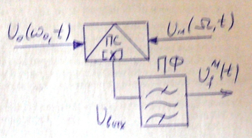 Основной элемент модулятор, осуществляет перемножение сигналов, на его входах. ВЧ – на несущей частоте