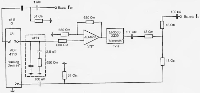 Синтезатор выполняется на основе ИМС ADF 4II3, который включает в себя частотно – фазовый детектор, делители частоты с переменными коэффициентами деления N, M, A, R, ЦАП и интерфейс программирования. Синтезатор работает в диапазоне частот Δf0=(1500:4000)МГц. С частотой ОГ f0Г=(5:550)МГц. ЦОС ФАПЧ включает в себя ФНЧ и ОУ на МС AD 820. Широкополосный ГУМ на МС М 3500 2235 – синхронизатор на частотах f0i: f0i=(NM+A)