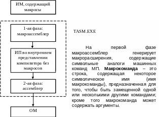Каждая инструкция ЯА генерирует одну команду в машинных кодах. В языках высокого уровня одной инструкции (оператору) соответствует несколько машинных команд. С этой точки зрения языки высокого уровня можно рассматривать как набор макрокоманд. Ассемблер содержит механизмы, позволяющие создавать и использовать в программах макросы, вызываемые при помощи макрокоманд. Макрокоманды позволяют вставлять в текст программы последовательности строк (которые могут быть данными или командами) и привязывать их к контексту места вставки. В общем случае можно говорить, что транслятор ассемблера состоит из двух частей – непосредственно транслятора, формирующего ОМ, и макроассемблера.