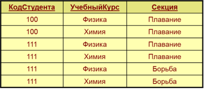 Это отношение имеет значительную избыточность и его использование приводит к возникновению аномалии обновления. Например, добавление информации о том, что студент 111 будет заниматься борьбой приводит к необходимости добавить две новые записи (по одной для каждого учебного курса) вместо одной.