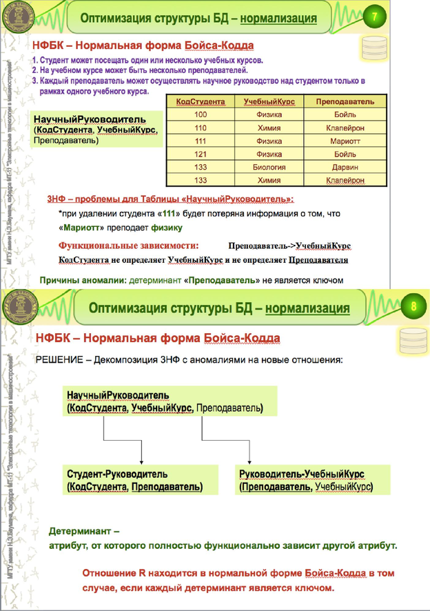 етерминант - атрибут, от которого полностью функционально зависит другой атрибут Форма Бойса-Кодда - в ней отношение называется нормальным, если каждый детерминант является ключом