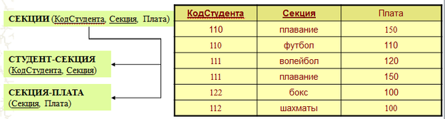 Зависимость множества значений атрибута Секция от множества значений атрибута КодСтудента (КодСтудента->->Секция)