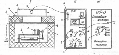 III. Октавный фильтр “ОФ-5": 1-переключатель частот,2-штеккер.