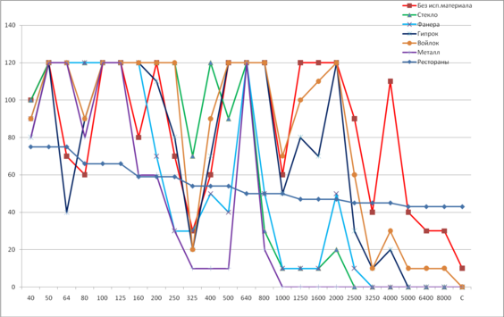 Вывод: по данным испытаний можно сделать вывод, что уровень звука ниже нормы для всех испытуемых материалов. Но, исходя из анализа графика видно, что наиболее лучшие шумозащитные характеристики имеет образец метал. Но так как для данного помещения не рационально использовать данный материал, то исходя из СНиП11-12-77 лучше будет использовать минераловатную плиту.