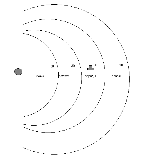 Зона І – зона детонаційної хвилі. Вона знаходиться в межах хмари вибуху. Радіус цієї зони можна розрахувати за формулою: