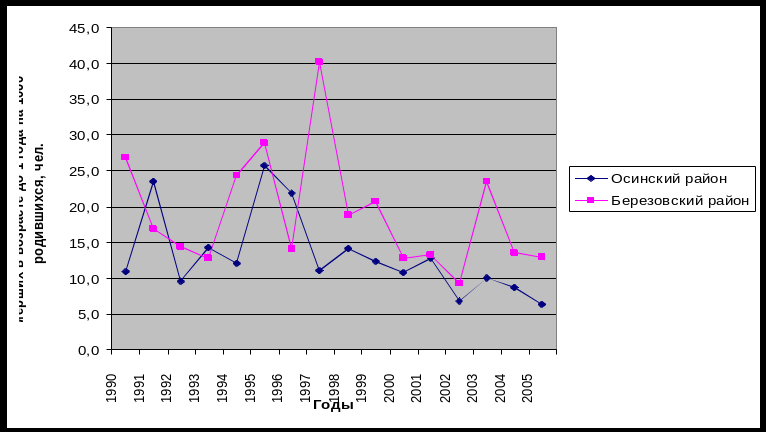 | Младенческая смертность в Осинском и Березовском районах в 1990-2005 гг. | |||||||||||||||||