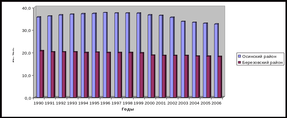 | Динамика численности населения Осинского и Березовского районов в 1990-2006 гг. | |||||||||||||||||
