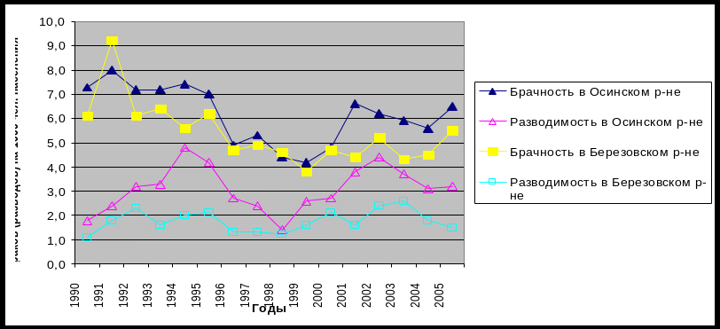 | Брачность и разводимость населения Осинского и Березовского районов в 1990-2005 гг. | ||||||||||||||||
