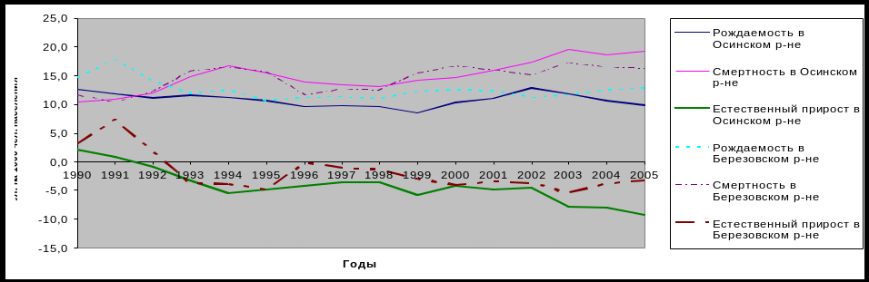 | Воспроизводство населения Осинского и Березовского районов в 1990-2005 гг. | ||||||||||||||||
