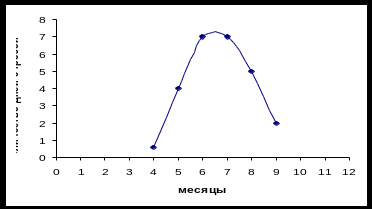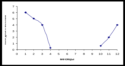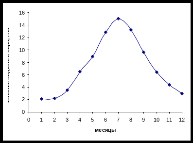 Наибольшее количество осадков, как видно на рис.6, выпадает в теплый период года. Максимальное количество осадков приходится на самый теплый месяц – июль (55мм). Минимум наблюдается в феврале – 17мм. Амплитуда колебаний составляет38мм.